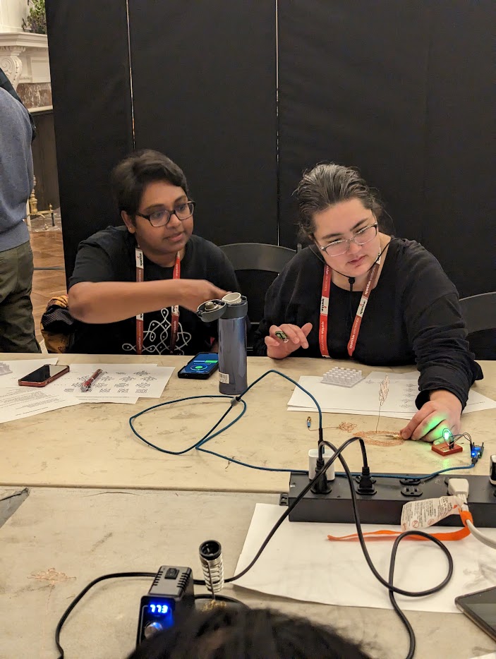 Kolam is a folk heritage craft from South India, generating intricate, winding, symmetrical, and geometric patterns. In this workshop, we use these patterns to build-a-long Kolam antennas using copper wire through wire-wrapping. All participants took home a Kolam wire-wrapped antenna that they can use for WiFi/Bluetooth applications.